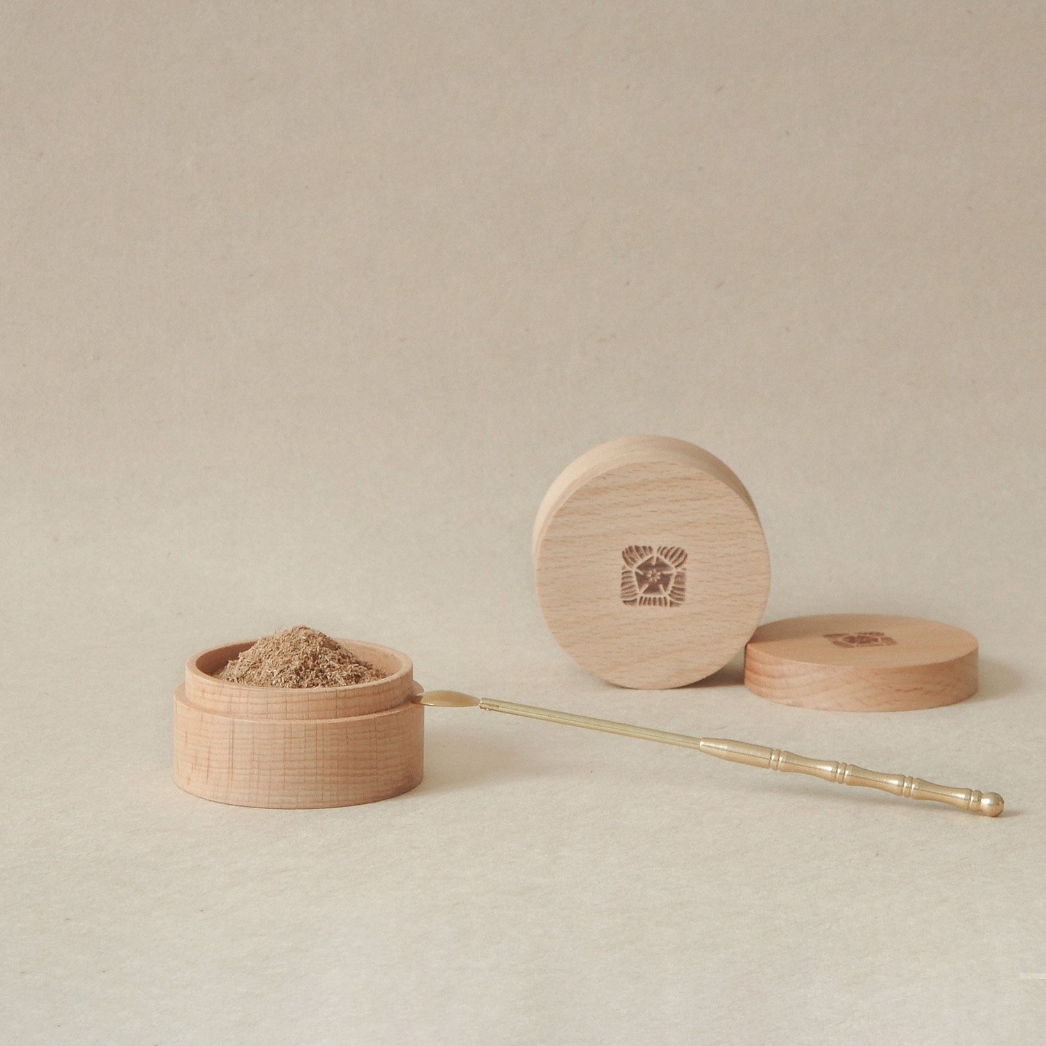 Chất liệu hũ đựng bột trầm: hũ gốm cho định lượng 20g, hũ gỗ dẻ gai cho định lượng 50g/100g.