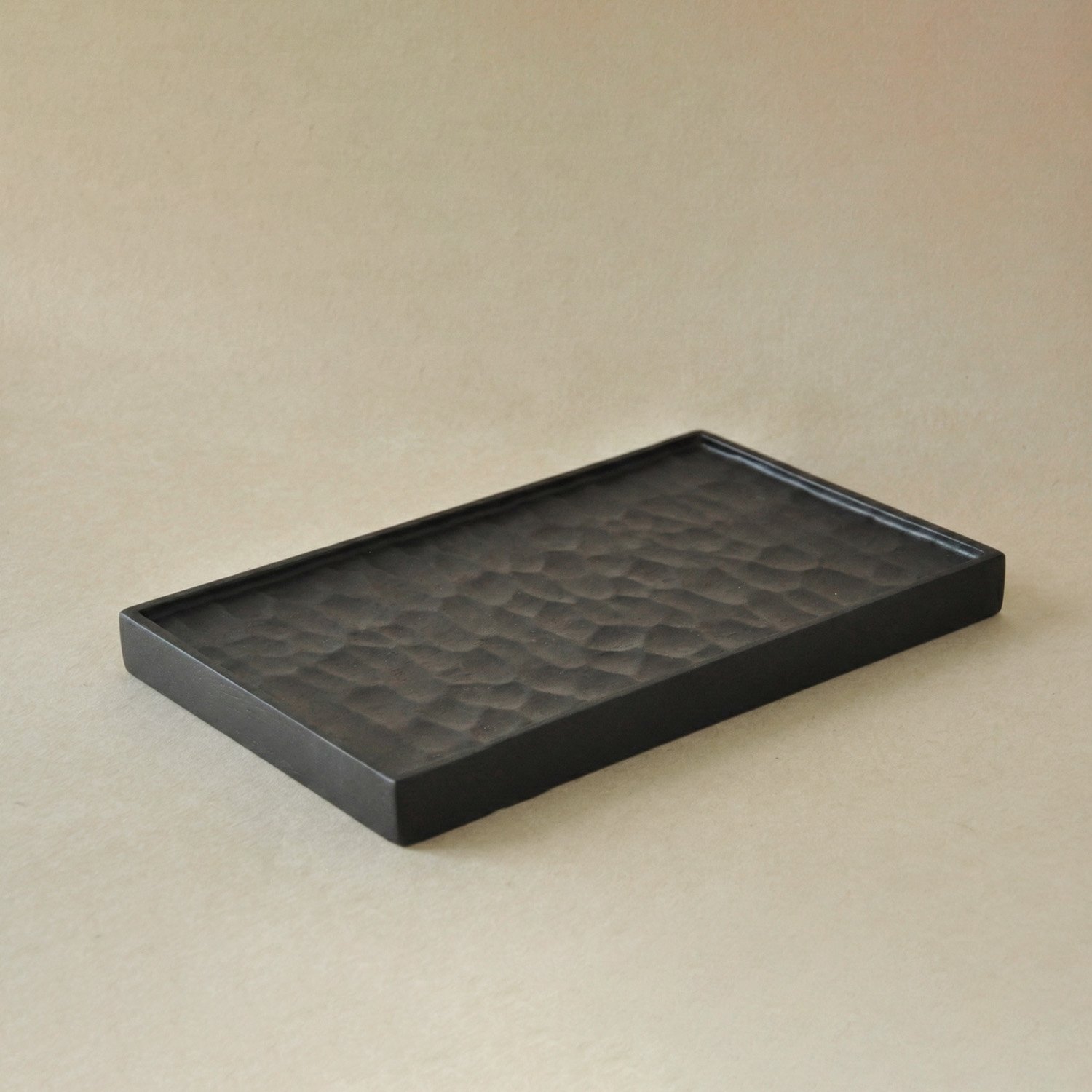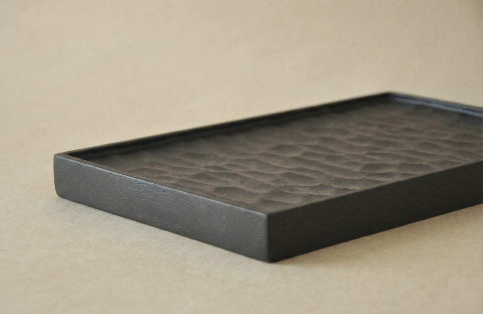 Khay làm từ gỗ biến tính. Bề mặt được xử lý gợn nhẹ, hạn chế trơn trượt, kích thước vừa đủ để đặt lò trầm, hũ bột, muỗng trầm.
